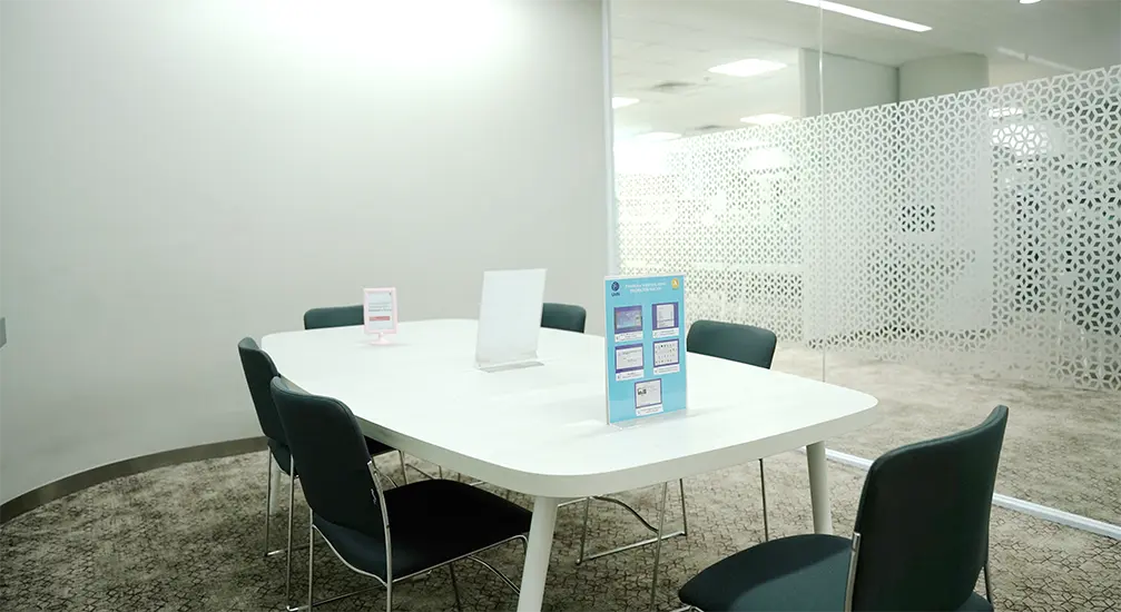 The Library Discussion Room consists of cubicles, Macintosh PC, and private discussion rooms. The capacity of the private discussion room is varied with different names; Tongkonan room, Honai room, Gadang room, Musalaki room, and Tambi room. Students can book these rooms beforehand on library.umn.ac.id.